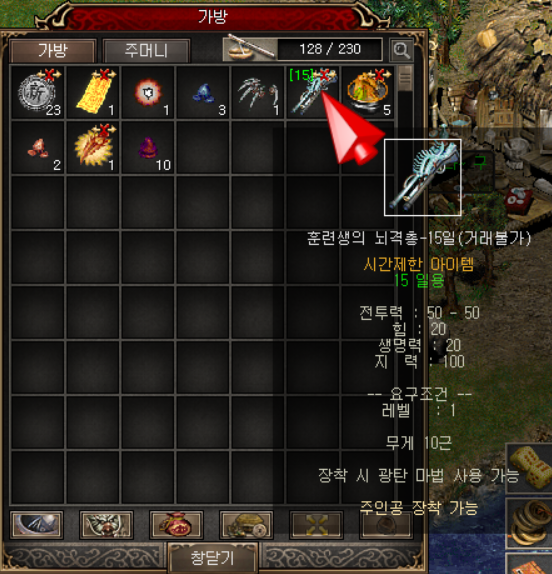 퀘스트로 받은 15일 기간제 훈련생의 뇌격총을 's'를 눌러 착용해 주세요.