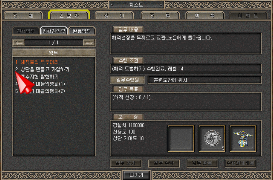 | 거상 - 퀘스트 - 초보자군영 - 13. 해적 토벌하기 (0) | 2025.02.09 |