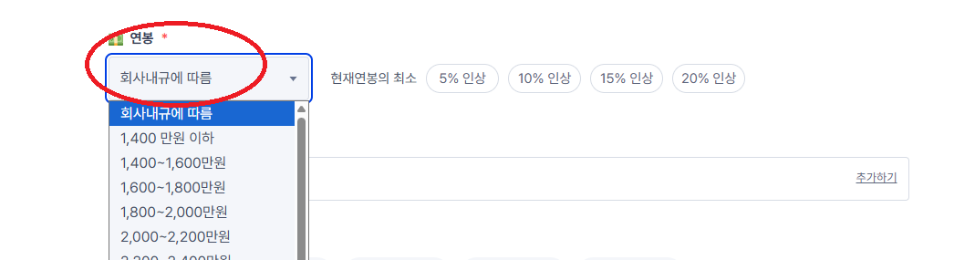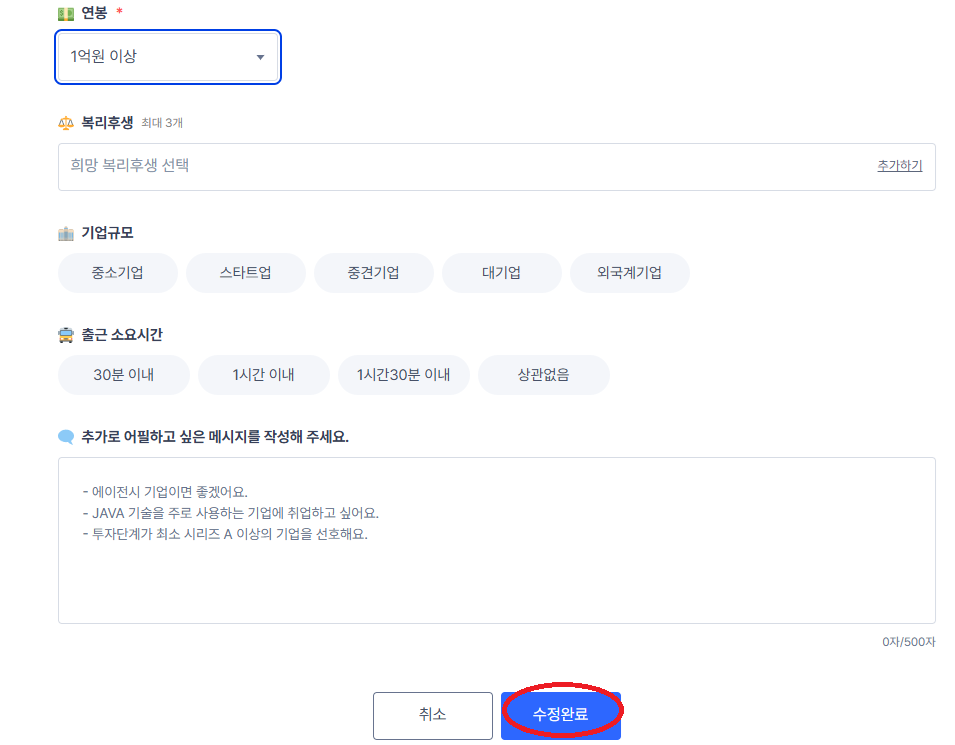 7. "연봉"카테고리에서 원하시는 연봉을 변경 후 "수정완료"를 누르세요.
