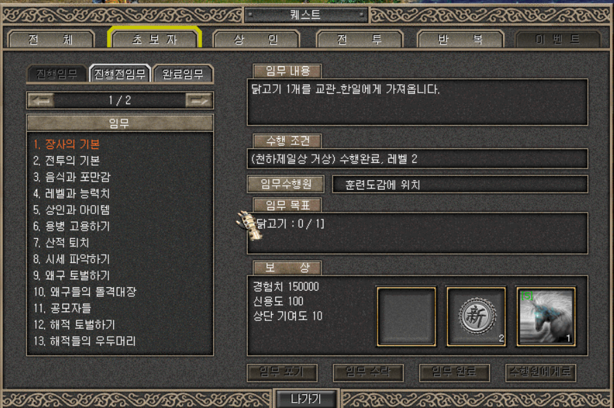 퀘스트 - 전투의 기본임무 내용너구리 20마리를 퇴치하고 교관_한일에게 돌아옵니다.수행조건(장사의 기본) 수행완료, 레벨 3임무수행원 훈련도감에 위치임무 목표너구리: 0 / 20 보상경험치 200
