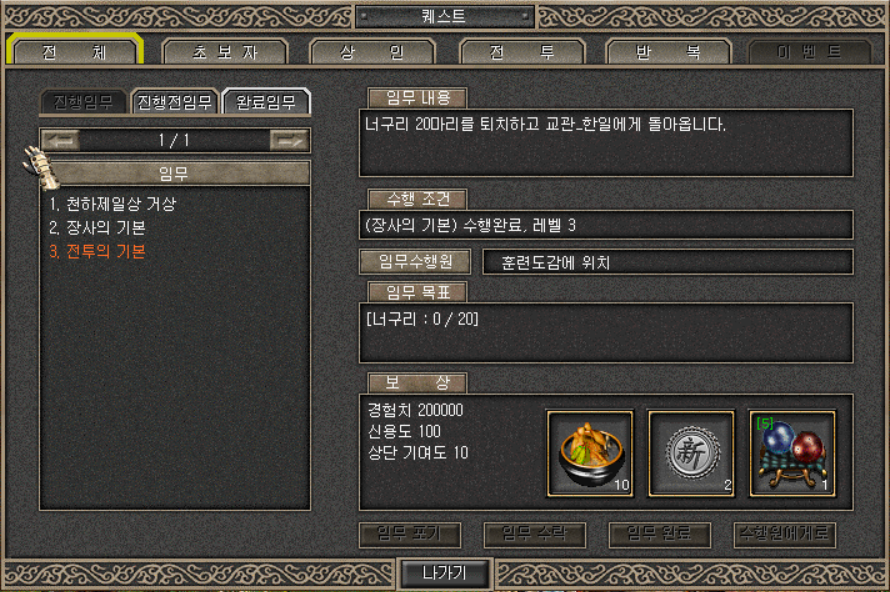 퀘스트 - 음식과 포만감임무내용포만감을 4000까지 모두 회복한 뒤 교관_한일에게 돌아옵니다. 수행 조건(전투의 기본) 수행완료, 레벨 4임무수행원훈련도감에 위치임무 목표포만감 : 4000/ 4000