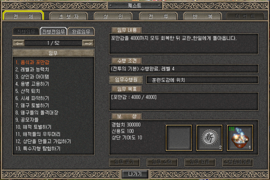 퀘스트 - 레벨과 능력치 임무내용레벨을 5까지 올린 뒤 교관_한일에게 돌아옵니다.수행 조건(음식과 포만감) 수행완료, 레벨 5임무수행원훈련도감에 위치임무 목표없음 보상경험치 500,000신
