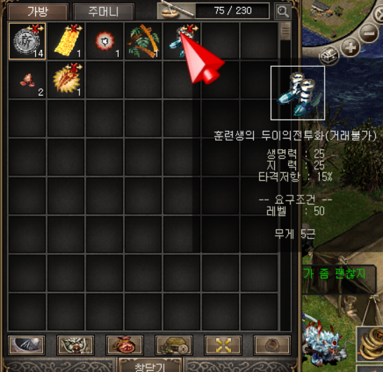 퀘스트를 완료하고 받은 '훈련생의 두이의요대(거래불가)'와 '훈련생의 두이의전투화(거래불가)'를 잊지 말고 착용하세요.