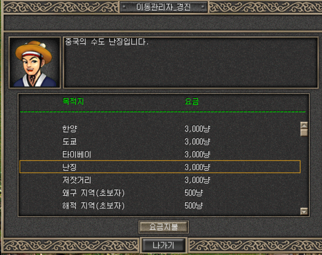 2. 주인공의 나라의 수도로 이동 (중국남자 > 난징) > 이동비용 3,000냥.