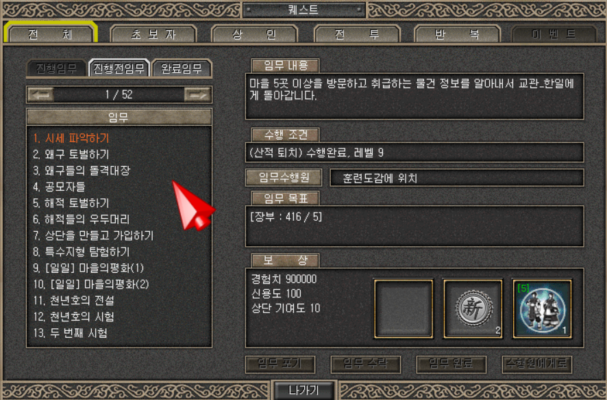 마을 5곳 이상을 방문하고 취급하는 물건 정보를 알아내서 교관_한일에게 돌아갑니다.